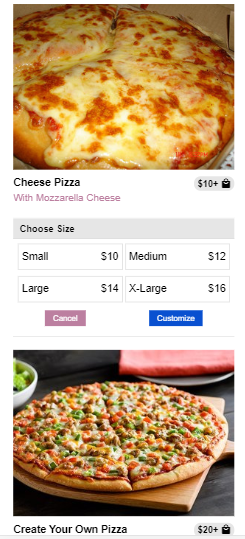 If there is 1 REQUIRED modifier attached to the item, then the modifier will be exposed to the user in line so they can seamlessly add the item to their cart. Once the user selects the ‘Price’ button they can either select the required modifier, select customize, or hit the cancel button if they no longer want this item.