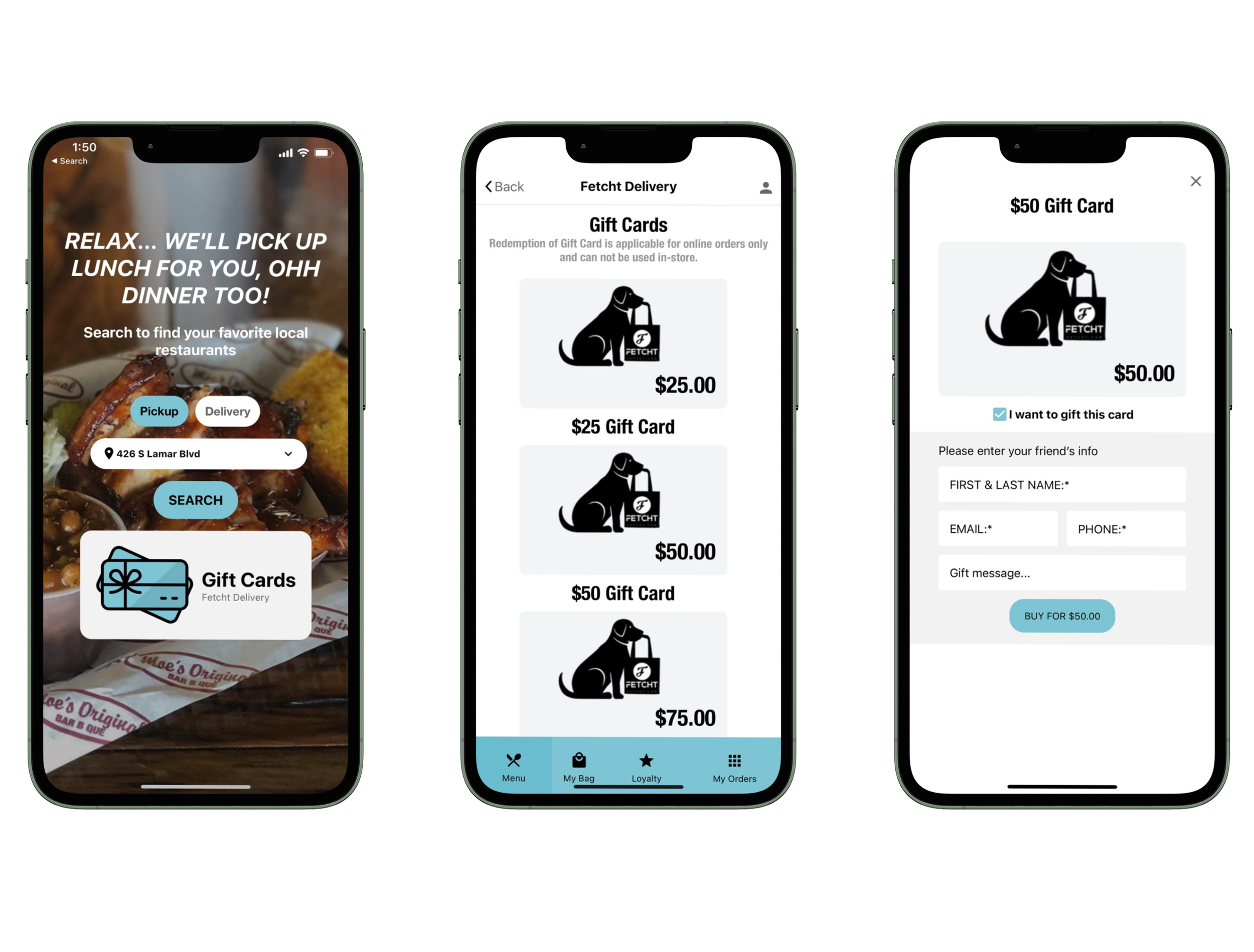 Customers can conveniently purchase gift cards directly within the app. They can easily buy gift cards for one or multiple recipients at a time and send them via email and/or SMS.