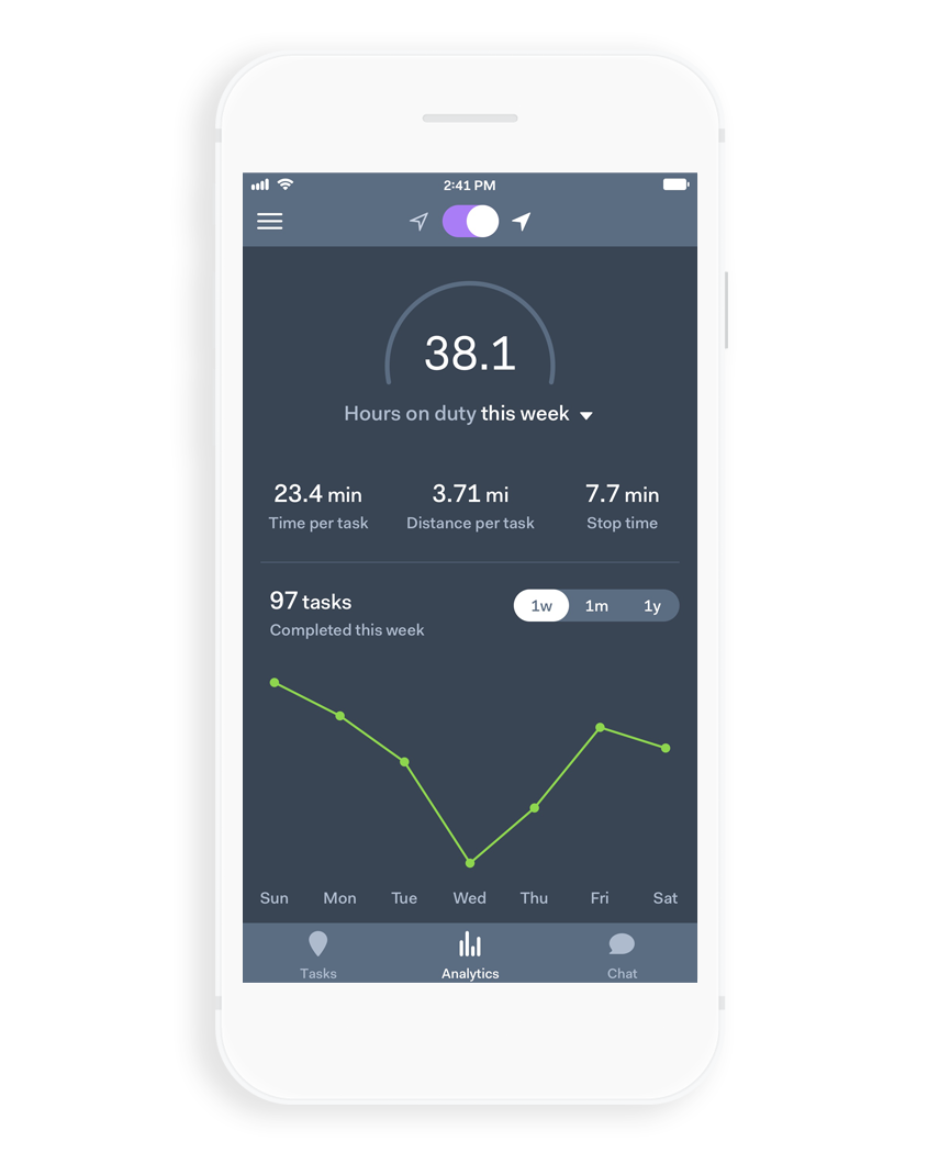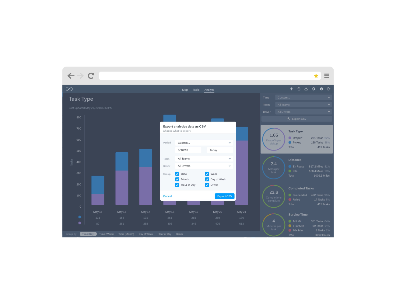 Onfleet lets you monitor key metrics to help you visualize success rates, on-time rates, service times, feedback scores, distance traveled, while at the same time you can segment data by teams, drivers, day, week, and even hour of the day.
