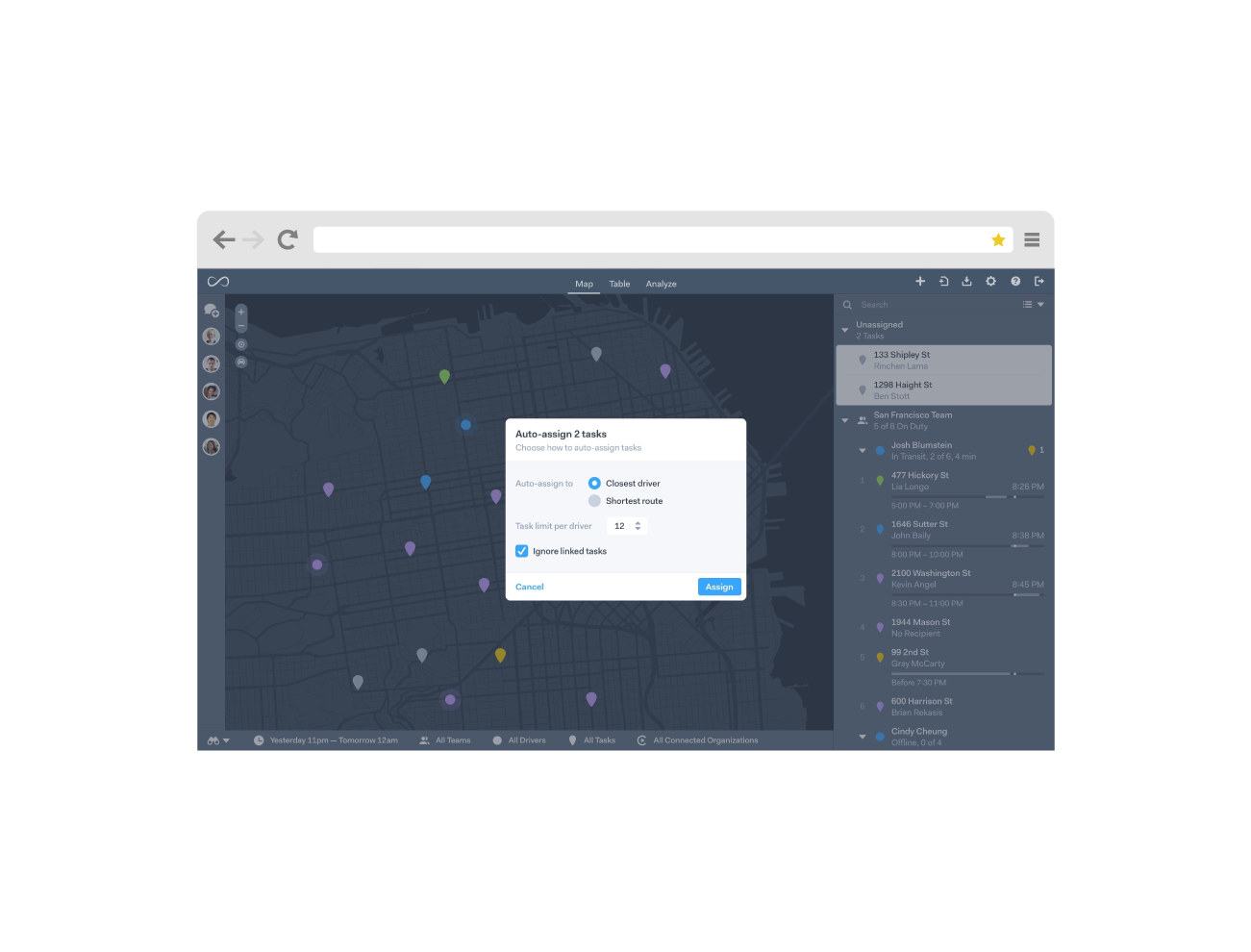 Consolidate routing and dispatch operations with one intuitive web dashboard. The integrated route optimization engine produces efficient routing solutions for drivers. Onfleet’s powerful auto-dispatch engine reduces service time and labor costs, while search filtering helps find drivers, customers, or pickup and delivery tasks.