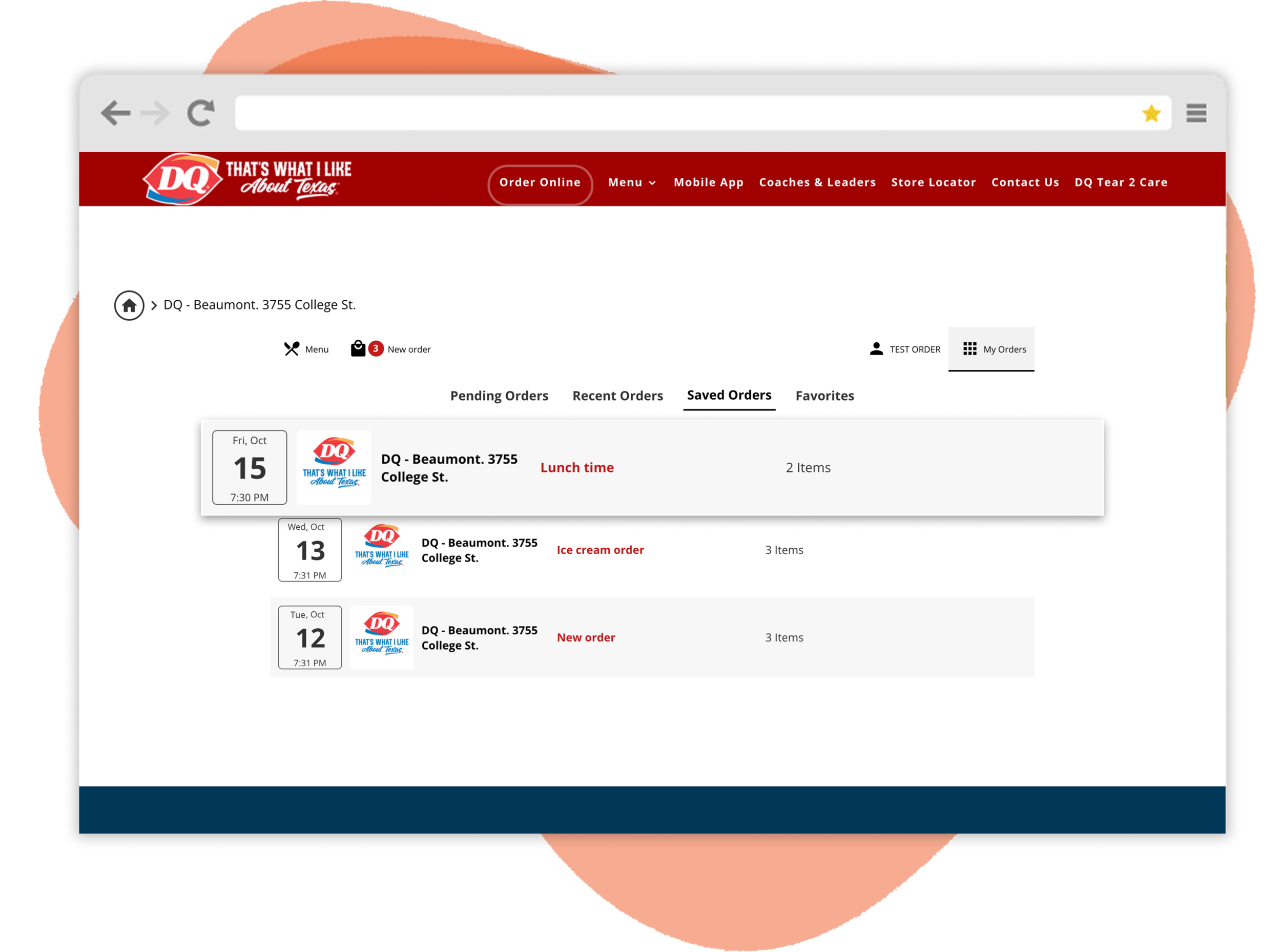 Personalized order dashboard for customers to view saved, pending, past, and favorite orders