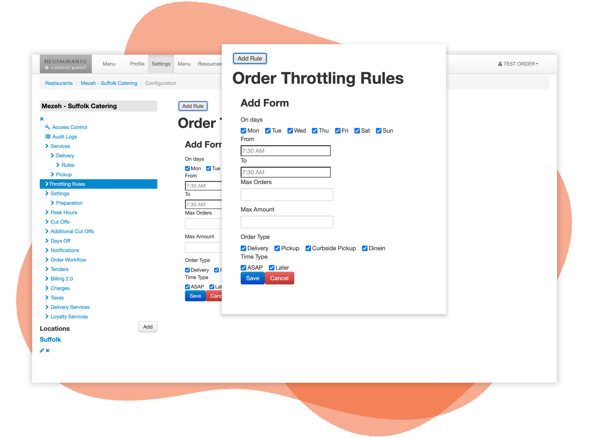 Create customizable delivery parameters, each with their own delivery minimums, times, charges, and sales tax