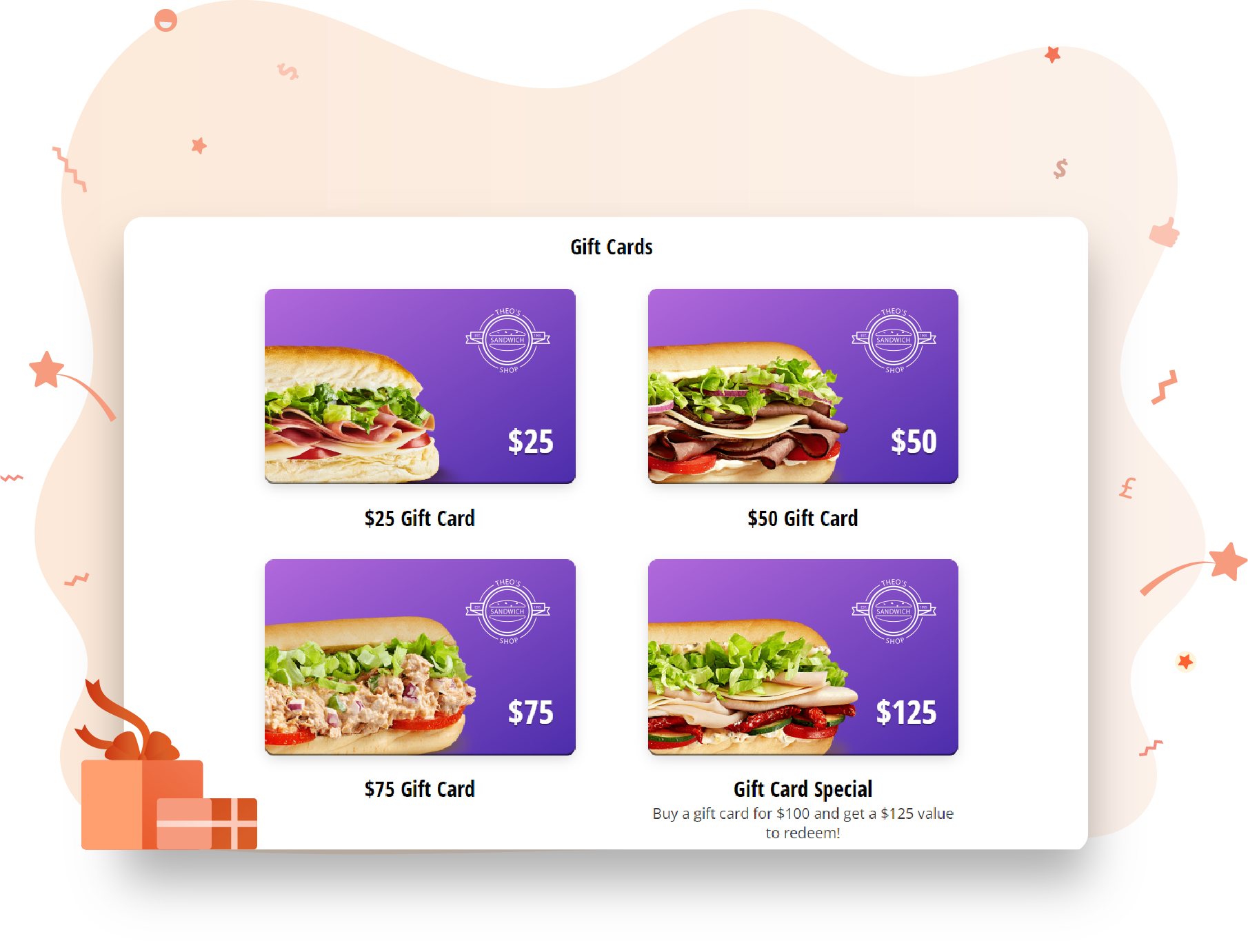 Gift cards exclusively purchased and redeemed via your online ordering platform, driving traffic to your website and app.