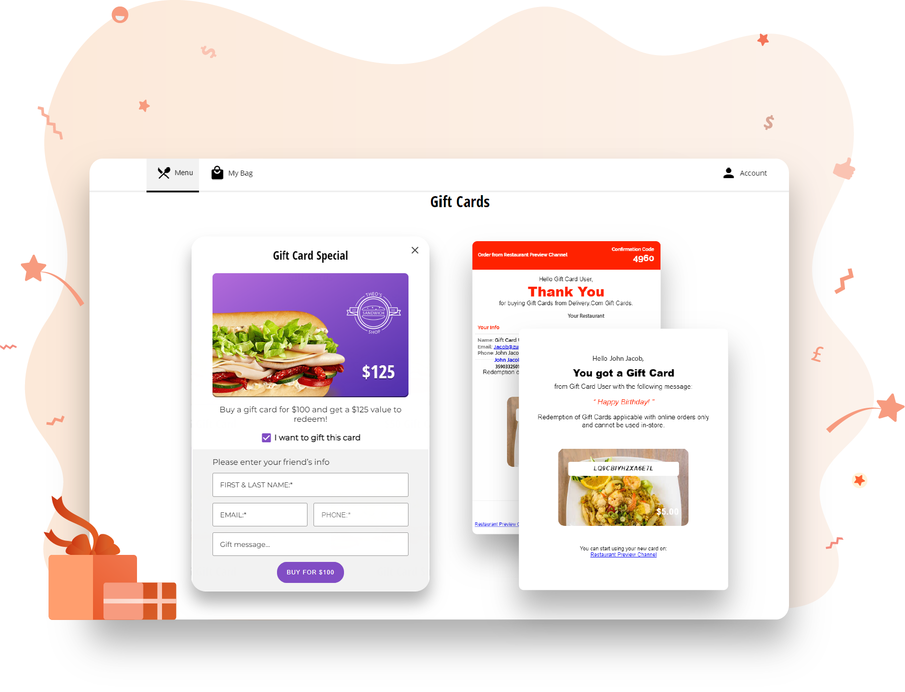 Seamlessly integrate Gift Cards into your online ordering platform for a frictionless experience.