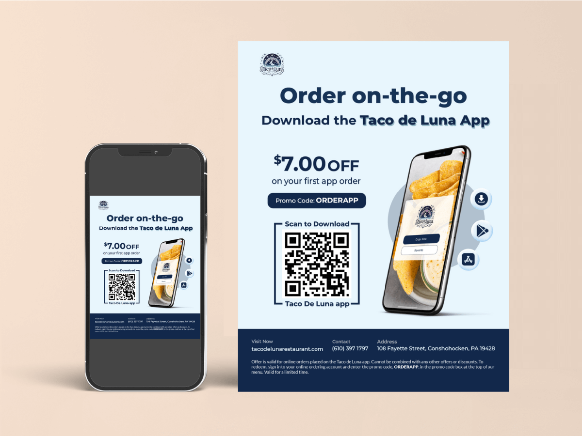 Grab attention across digital channels with visually compelling flyers designed to drive customer action. These flyers highlight your restaurant’s online ordering, mobile app, loyalty program, or gift cards—paired with exclusive offers to encourage sign-ups and repeat orders.
