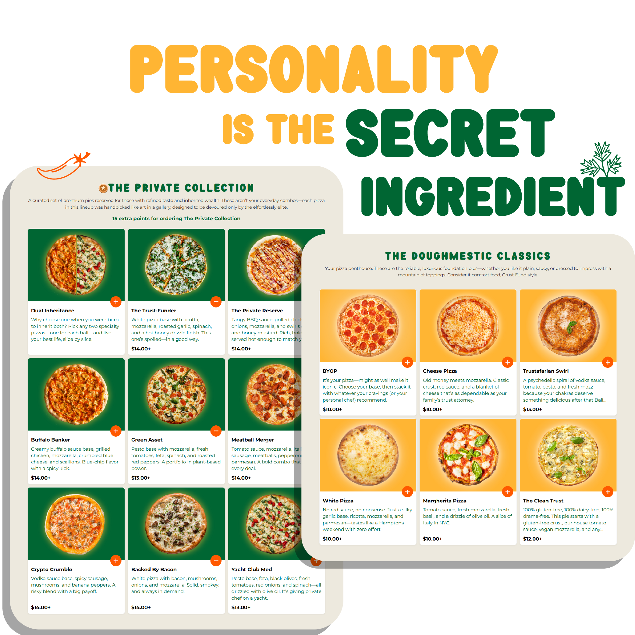 Item Descriptions: Fun, conversational, totally on-brand. Like your best friend explaining their dream pizza after three glasses of wine.