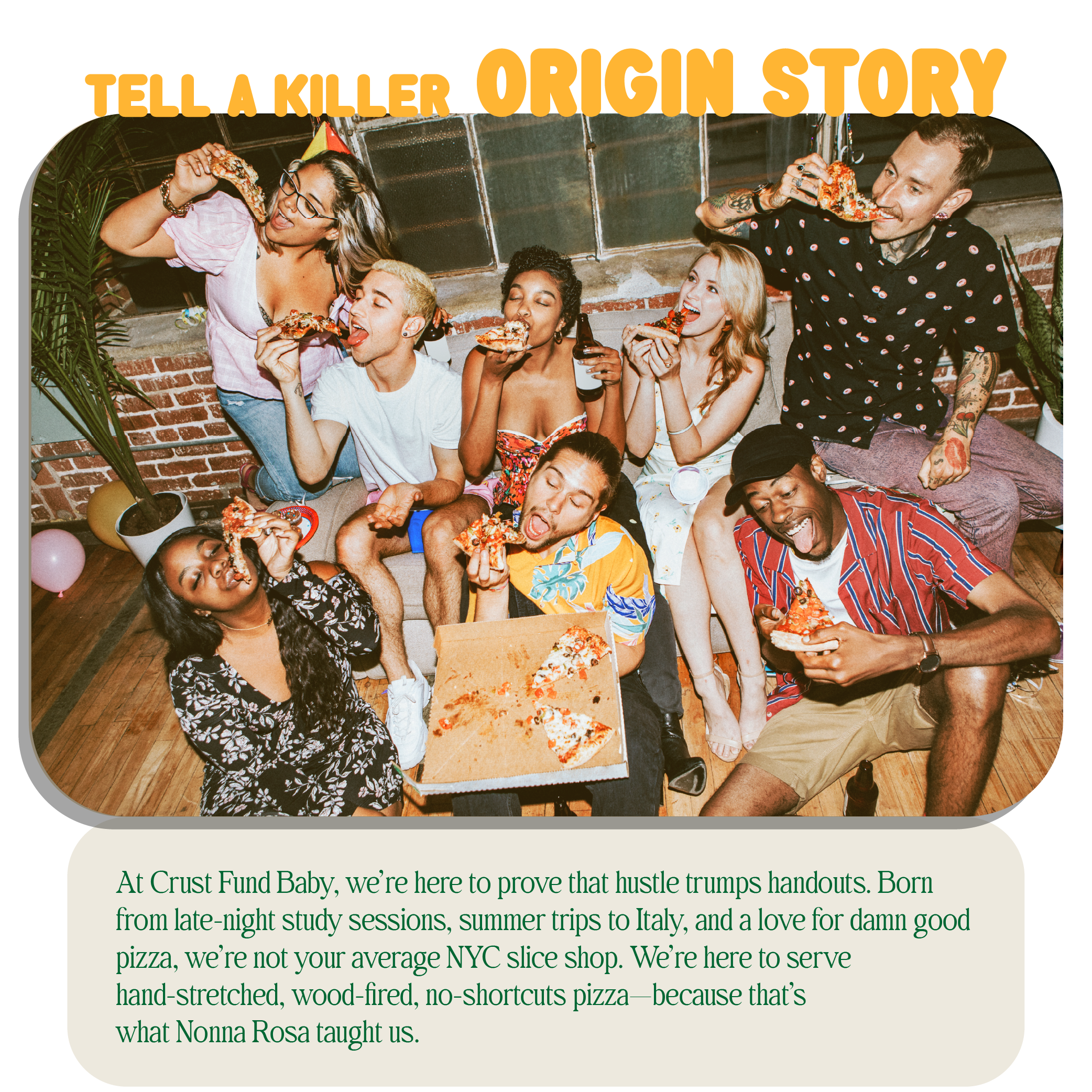 Crust Fund Baby nails this. Their tone, style, and personality are perfectly in sync with their target audience: college kids, pizza purists, foodies with attitude, and anyone who loves a bold slice with a side of sass.