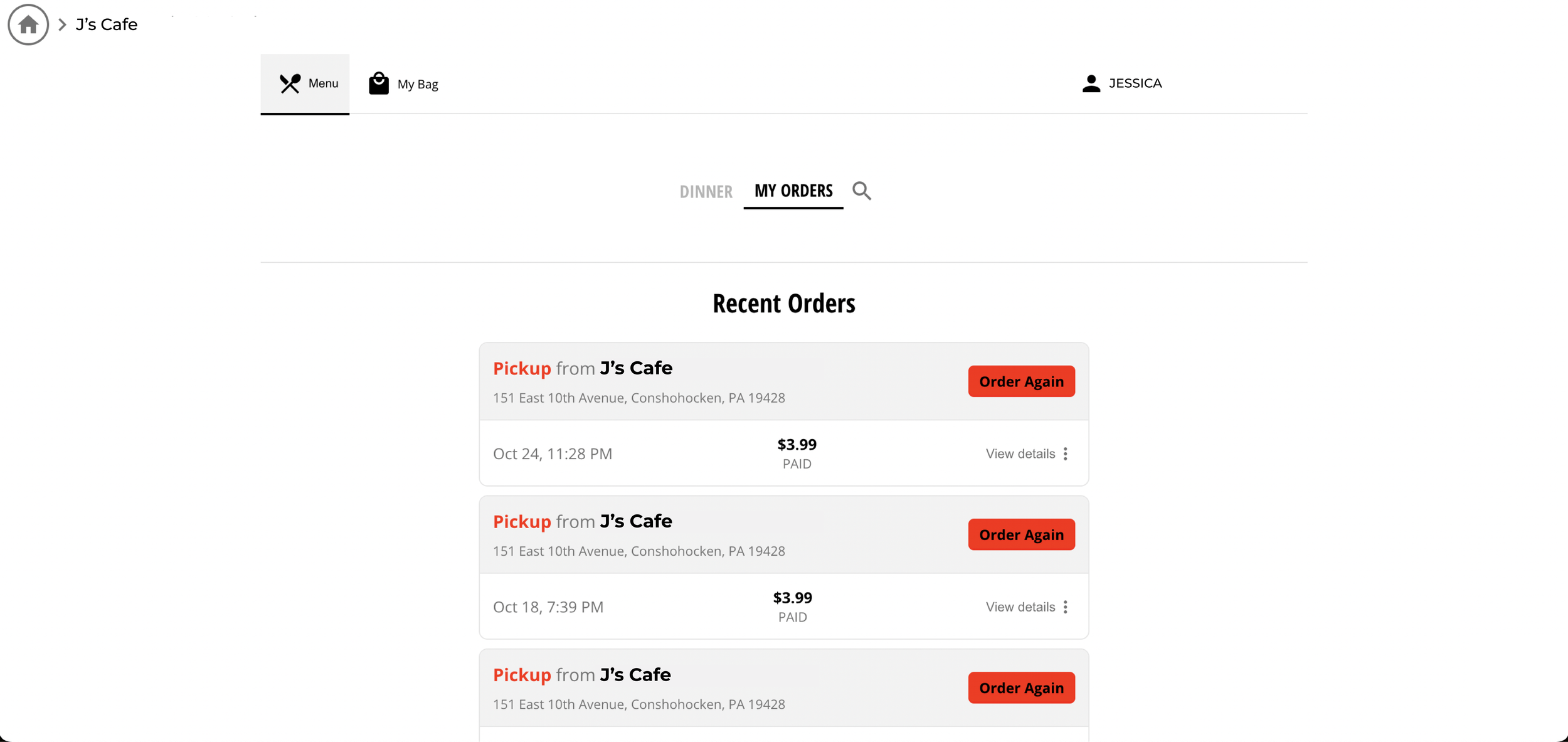 “My Orders” Tab on the Menu: Customers can quickly access and reorder past orders without navigating to their profile.