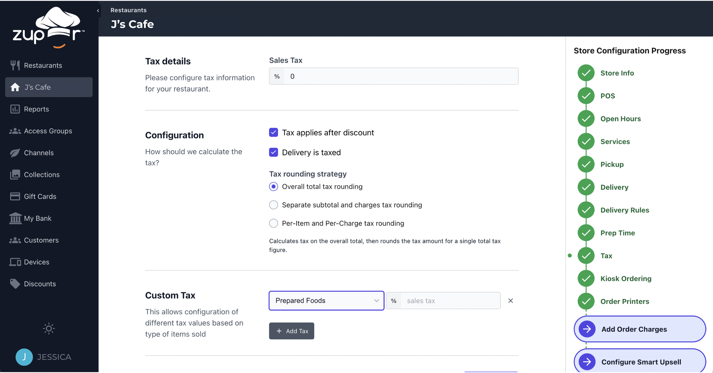 Custom tax rates can be defined in the Tax section of a Chef profile.
