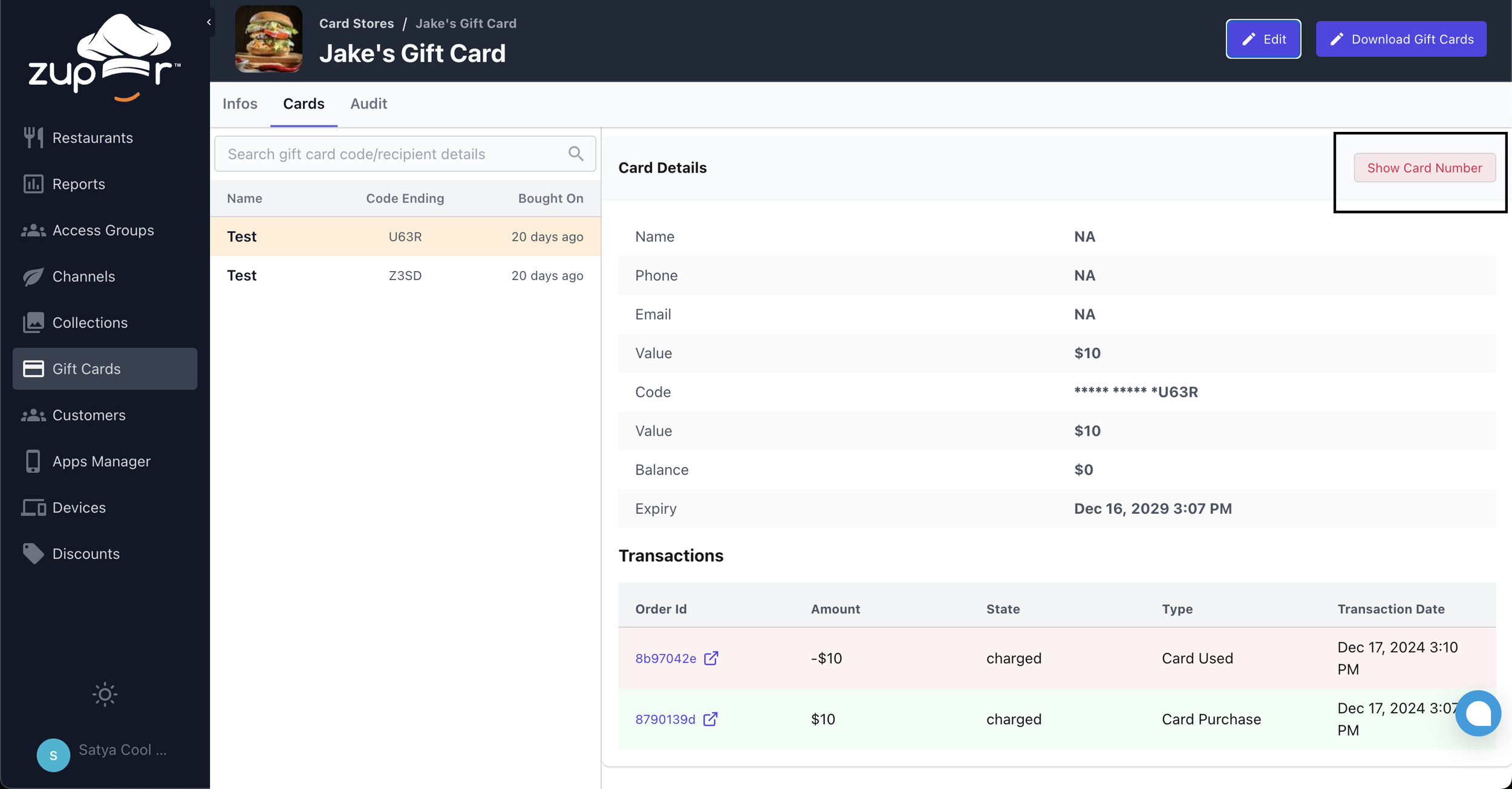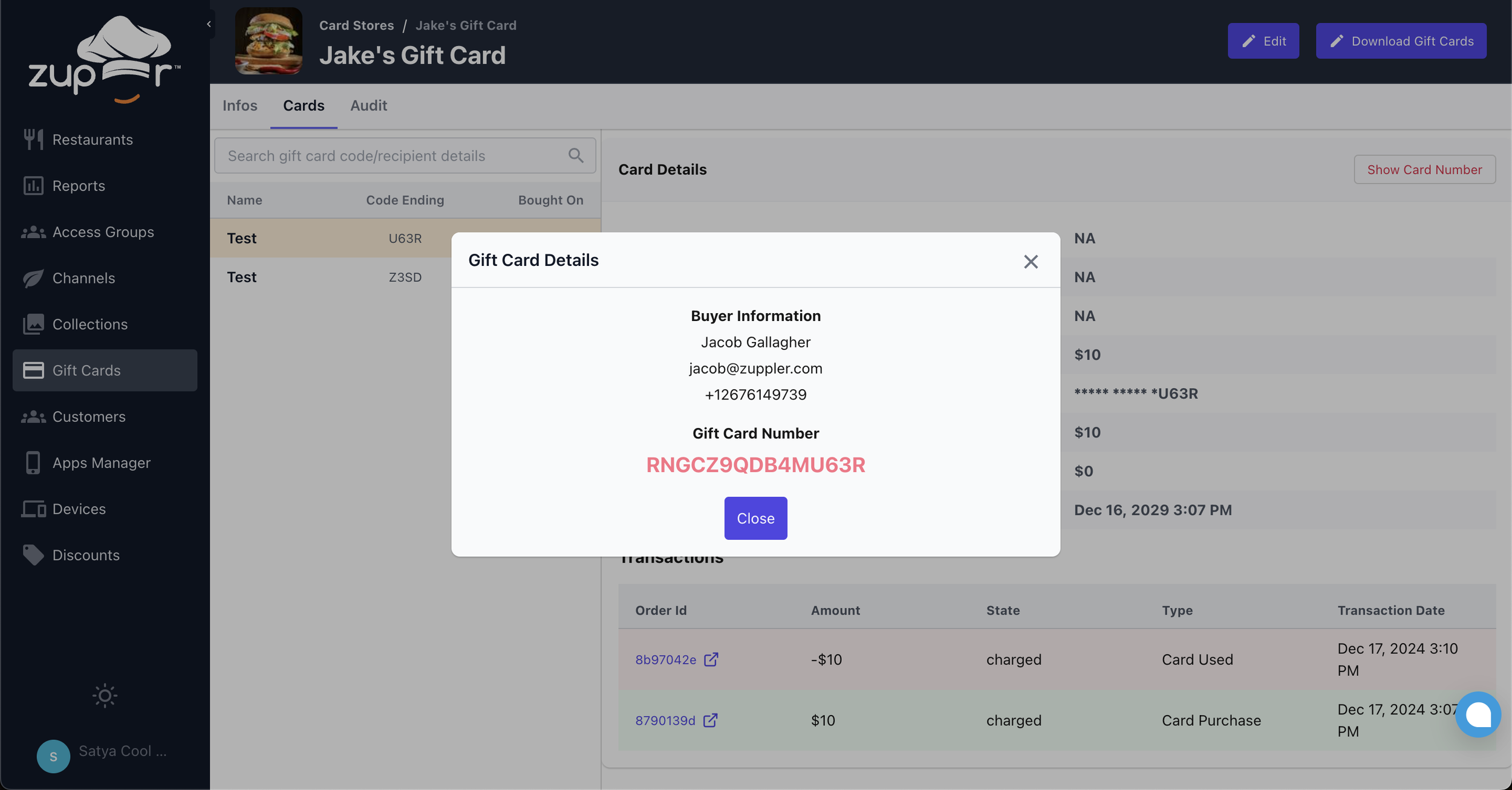 You and your employees with admin rights can securely view customers’ purchased card details, ensuring better management of gift cards.